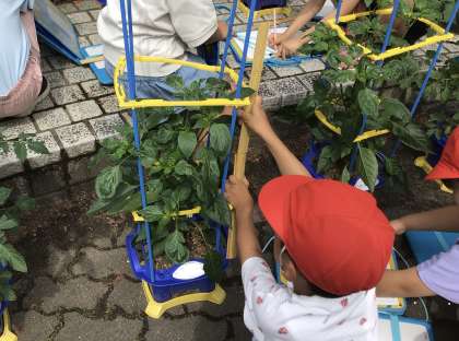 夏野菜の観察をしました。苗の丈がぐんと伸びて、小さな実もつきはじめました。