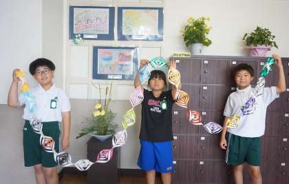 家庭科・クラフトクラブの子たちが「七夕飾りです。飾ってください」と作品を届けてくれました。職員室廊下に飾りました。明るい雰囲気になりました。