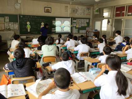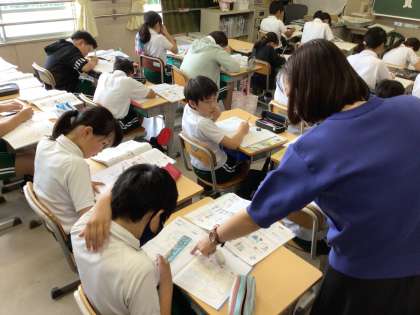家庭科の授業で、衣服の働きについて学び、快適な着方について考えました。帽子や日傘、服の色など、たくさんの意見が出ました。また、綿、麻、ポリエステル、毛の4種類の布に水を染み込ませたときの、吸水性や速乾性について、実験動画を見ながら確かめました。