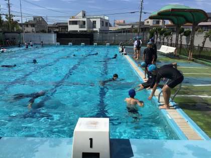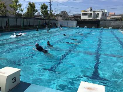 今日のかえるコースは平泳ぎの練習を中心的に行いました。「スーパーポン」の掛け声に合わせて、「スー」でしっかり伸びることを意識しています。奥ではおたまじゃくしコースの子たちがビート板を使って泳ぐ練習をしています。
