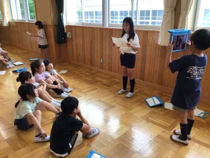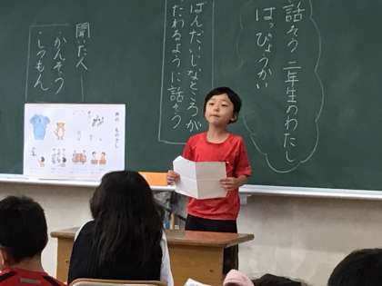 二年生になってから心に残ったことについて、みんなの前で話す学習です。話す練習をタブレット動画で撮り合い、班でアドバイスをし合いました。
