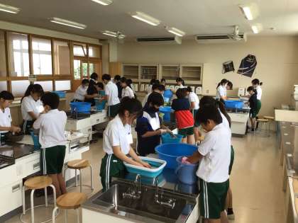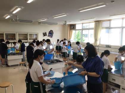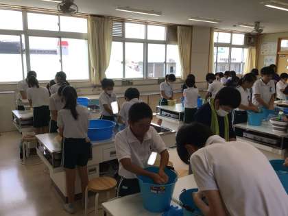 今日は洗濯実習をしました。たらいで洗剤と水を混ぜて洗濯液をつくり、自分のバケツにうつして靴下を手洗いしました。子どもたちは自分たちで綺麗にした靴下を見て、満足そうにしていました。
