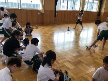 風の大きさ実験を行いました。風の大きさを変えると、車の進む距離はどんな風に変わるかな?