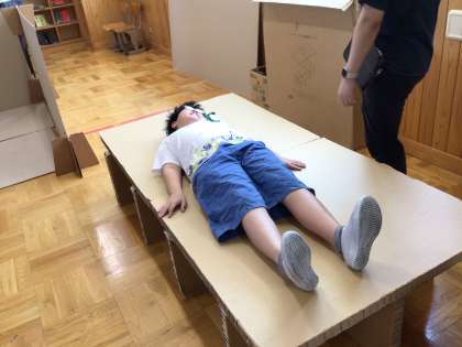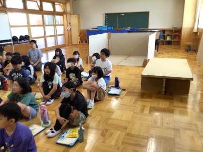 総合的な学習で『守ろういのち〜わたしたちの防災計画〜』の調べ学習を進めています。市役所の方をお招きして、分散避難や垂直避難についてお話を聞いた後、避難所でのダンボールで仕切られた一家族分のスペースやダンボールベットを体験しました。