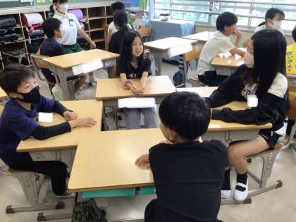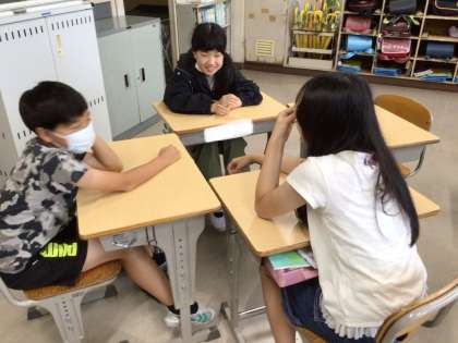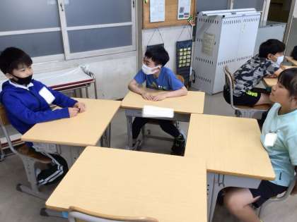 朝の学習で、もしもトークを行いました。テーマは「無人島に持っていくなら」でした。司会者が上手に進行しながら、話し合いをしていました。