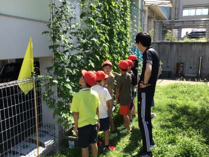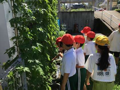 5月ごろに植えたツルレイシに実ができ、とても嬉しそうに観察しました。今後どのように成長するか、夏休み明けの観察が楽しみです。