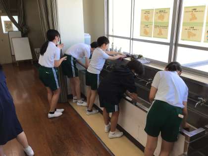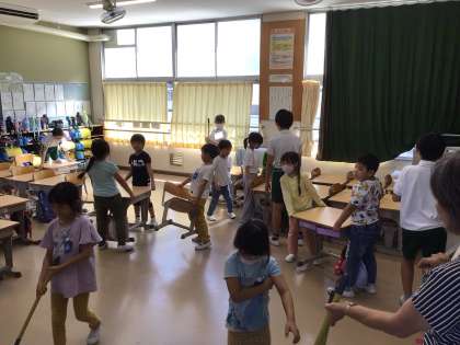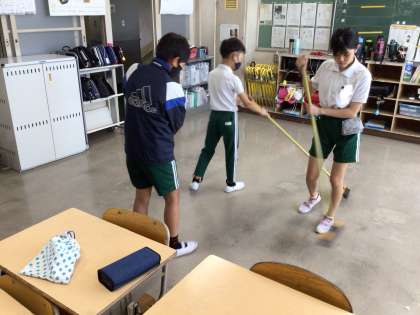 今日も美しい学校を目指して、掃除をしています。 1年生の子たちも、6年生と一緒に頑張っています。