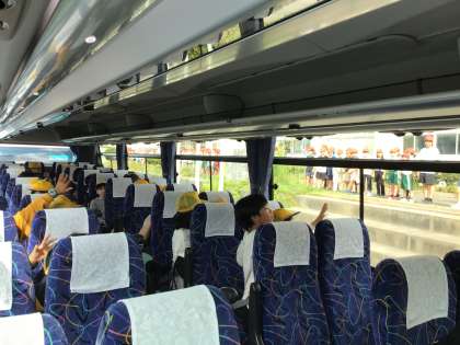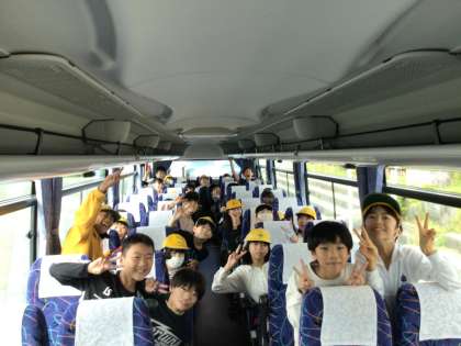 見送りに、4年生が来てくれました。6年生は、教室から手を振ってくれました。バスの中は、笑顔一杯です。