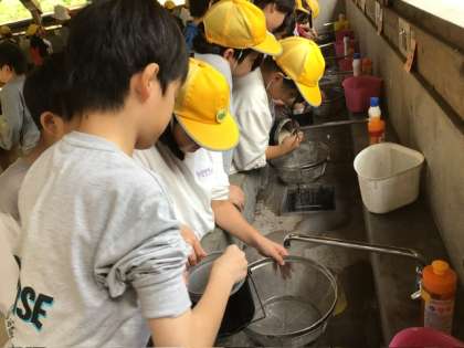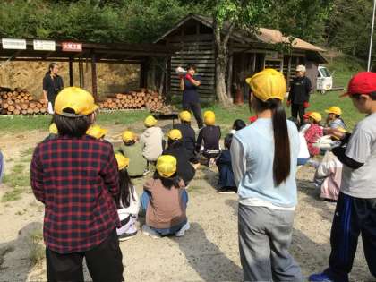 ファミリーサイトに移動してきました。野外炊飯の準備を始めます。班で分担して行います。