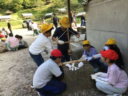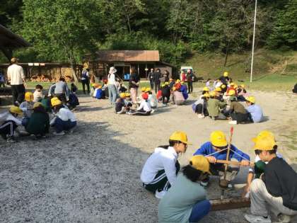 火起こし体験が始まりました。かけ声をかけながら、協力して行なっています。