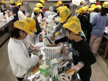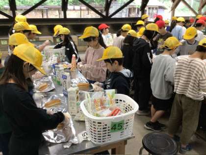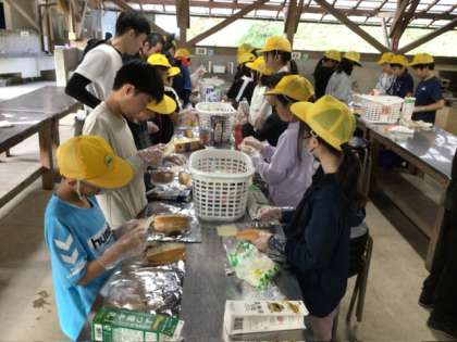 朝食は、カートインドックです。各自で食材をパンに入れ、アルミホイルで巻いていきます。