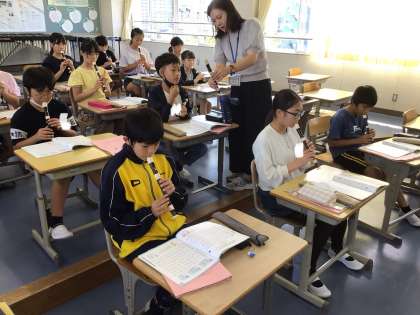 6年 音楽 公開日 2024/09/26 更新日 2024/09/26 各学年から 「雨のうた」の練習中です。親指を少しずらして穴を全部塞がないサミングが多く難しいですが、正しい運指で吹けるように頑張っています。