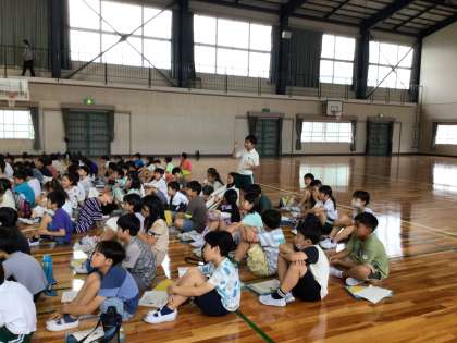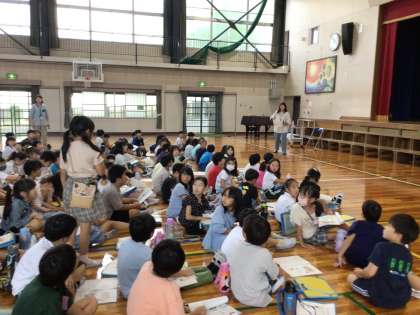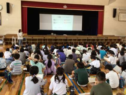3年 福祉実践教室 公開日 2024/10/03 更新日 2024/10/03 各学年から これから総合的な学習の時間で勉強する「福祉」について、外部から講師の先生を招いてお話を聞きました。「福祉」とは、「みんなのしあわせ」のこと。「みんなのしあわせ」のためにどんなことができるか、これから学んでいきます。