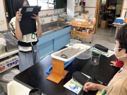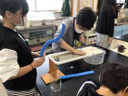 流れる水の働きを確かめる実験をしました。