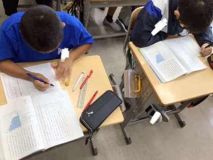 6年 国語 公開日 2024/10/09 更新日 2024/10/09 各学年から 「永遠のごみ」プラスチックの単元では、教材文を読み、表や資料の情報との関係の確認をしました。そして、情報をもとにプラスチックのごみをなるべく減らすために自分たちに取り組めることを考えました。