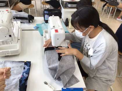 今日もトートバッグ作りの続きをしました。ミシンのフリーアームにバッグの口をいれて、回しながら縫っていくのがポイントのようです。頑張っています。