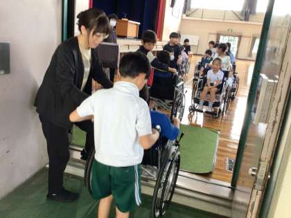 福祉実践教室で、外部講師の方に来ていただき、車いす体験・講話を行いました。実際に車いすで生活されている方のお話を聞いたり、車いすに乗る体験をしたりと、貴重な経験をすることができました。