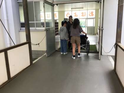 車いす体験・講話の様子です。車いすの体験を通して、少しの段差が怖いことや、不便さに気づくことができました。