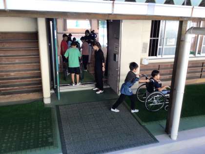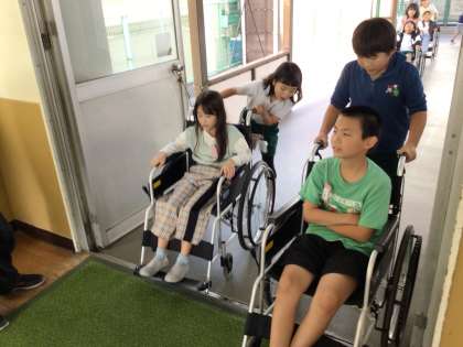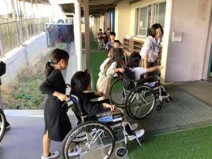 昨日に引き続き、本日は1、2組が福祉実践教室を受けました。車いす体験を通して、小さい段差の怖さや、道幅の狭いところの不便さを実感することができました。