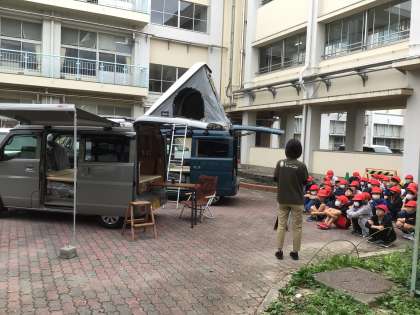 豊田市では、災害時に車中泊避難を推奨しています。そこで、総合的な学習の時間に、錦町の自動車販売店 ユーズネット豊田より、社長さんと会長さんをお招きして車中泊車中泊体験を行いました。