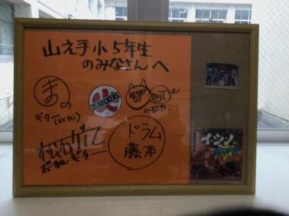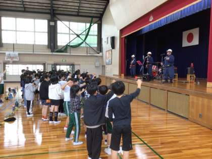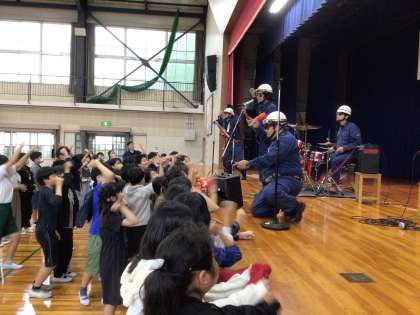 総合的な学習の時間内、防災学習の一環で、地域のために活動されている消防団について学びました。今日はその発展学習として、石野地区で消防団員として活動されているロックバンド THE 消防ロッカーズのみなさんにお越しいただきました。消防団あるあるを歌で紹介していただいたり、質問コーナーでも快くお答えいただいたり、楽しく盛り上がって学習することができました。山之手小学校の体育館がライブハウスのような一体感に包まれた、最高のひとときとなりました。