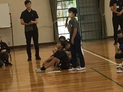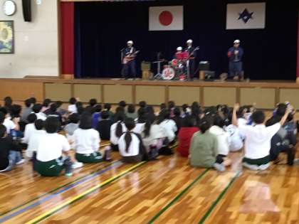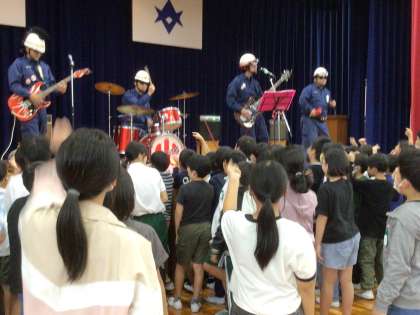 総合的な学習の一環で、消防ロッカーズによる出前授業を行っていただきました。消防団の仕事について歌を通して分かりやすく楽しく教えていただきました。子どもたちは、ノリノリでライブを楽しみました。