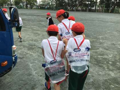 総合の体験学習第4弾として、上下水道局の方々にお越しいただき、給水車で水をくむ体験をさせていただきました。6リットルの水を入れて、運動場から多目的室までの道のりを背負って歩きました。簡単‼︎楽だなあ等と言っていた子たちも、家まで持っていくことや、マンション住まいの人はさらに階段を登ること、そして何より6リットルは1人が使う2日分という事実を知り、考えが変わった様子でした。