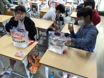 子どもたちの中には、体験の延長で、自宅まで水を運んでみようと持ち帰った子もいます。袋は飲用でなければ繰り返し使用できるそうです(給水後、煮沸すれば飲用にもできるようです)。ご家庭でも一度体験してみてはいかがでしょうか。