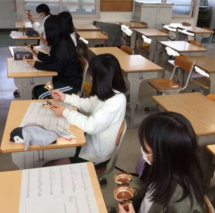 音楽クラブの様子です。ハンドベルのきれいな音が聞こえてきました。本日の課題曲は「ハイホー」でした。
