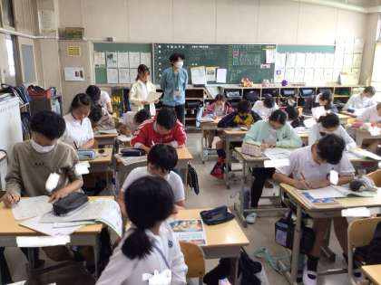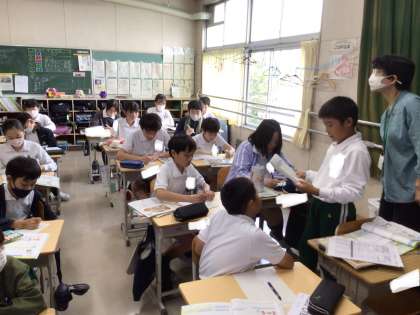 今日の外国語では、身の回りのものがどこの国から来たのか調べて発表しました。