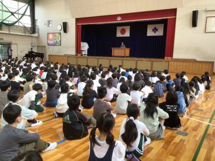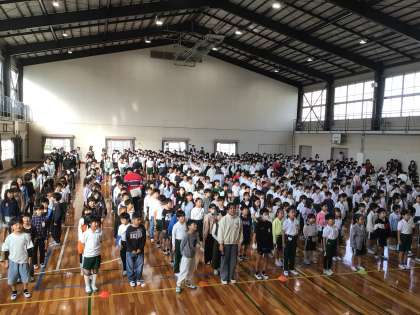 最後に全校で「ビリーヴ」を歌いました。体育館に歌声が響いて気持ちの良い朝の活動を行うことができました。