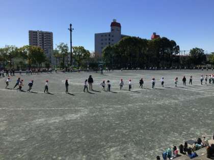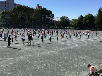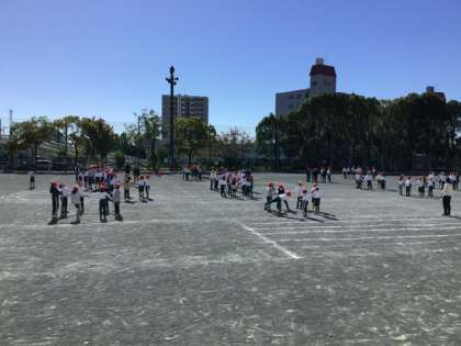 3年生の表現の練習です。何度か体形を移動するため、位置の確認をしていました。低学年では、難しい体形移動をがんばっています。