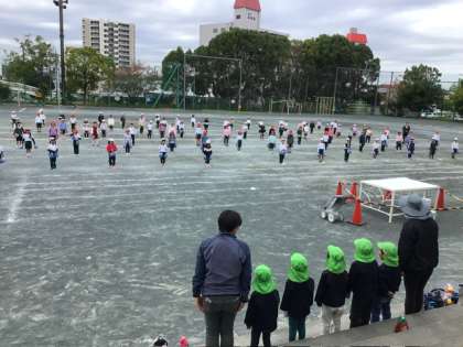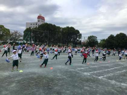 運動会練習では、ポンポンを持って行いました。リズムにのって、楽しそうに踊っていました。今日は、1年生の練習に合わせて、山之手こども園の年長さんたちが、見にきてくれました。1年生のがんばりに、大きな拍手をもらいました。