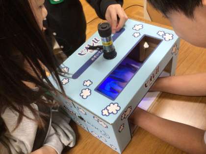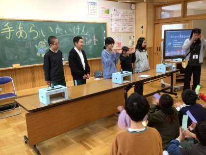 手洗い体験イベント 公開日 2024/11/26 更新日 2024/11/26 各学年から 保健委員会主催の『手洗い体験イベント』に参加しました。手洗いチェッカーを手につけ、ふだんどおりに手洗いをして、ブラックライトBOXで洗い残し部分を確認しました。洗い残しが多いのに驚きました。