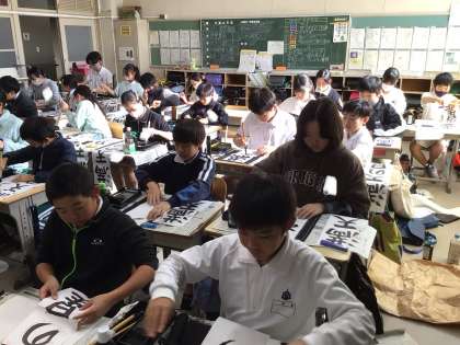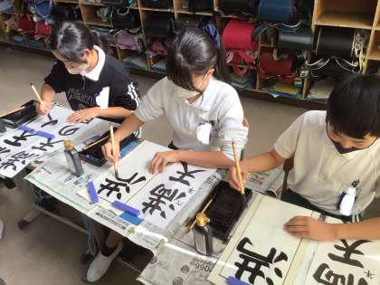 書写の時間に、書き初め練習が始まりました。小学校最後の書き初め大会に向けて、集中して練習しています。