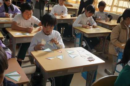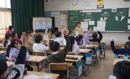 3年生算数の研究授業の様子です。「三角形」の単元で、辺の長さに注目して、三角形を仲間分けしました。同じ辺の長さの数で、二等辺三角形や正三角形になることを知り、自分で長さを確認しながら弁別しました。見た目では判断に迷う図形も、コンパスで長さを測り取って比べることができました。