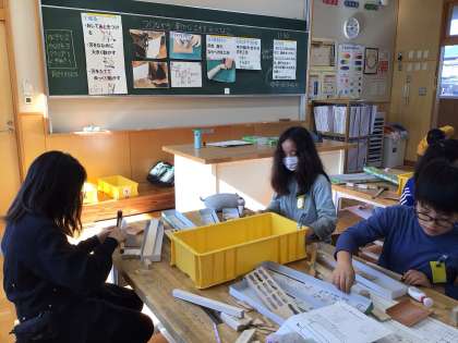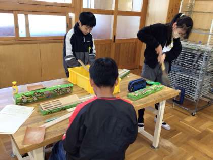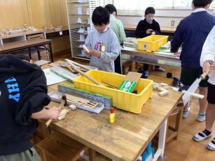 4年生図画工作科「のこぎりギコギコ」の授業の様子です。木を切ったり組み合わせたりして感じたことなどから、表したいことを見付け作品を作っていきます。のこぎりを安全に使うことや木を思いのままに切ることの楽しさを感じてほしいです。