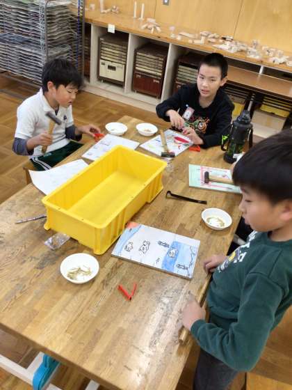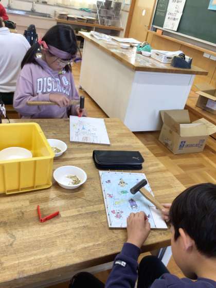 3年 図工 公開日 2024/12/03 更新日 2024/12/03 各学年から 図画工作科の授業の様子です。くぎを打ってコリントゲームを作っています。初めての図工室での作業、怪我をしないように注意しながらやっています。