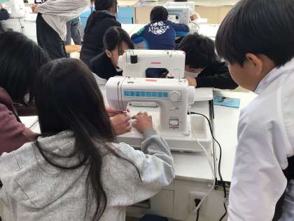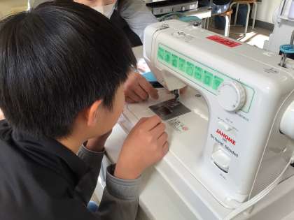 家庭科の授業でミシンの学習をしました。上糸や下糸の準備を一つ一つ確認しながら直線縫いまで行いました。ミシンサポーターの方に来ていたたき、丁寧に教えていただきながら取り組みました。