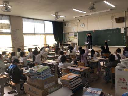 新出漢字の学習の様子です。「たて」「よこ」「はらって」など声に出しながら空書きをしています。