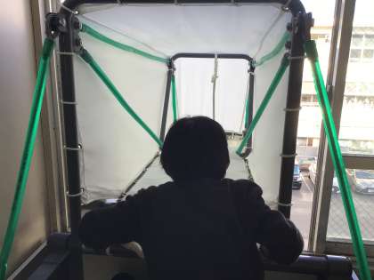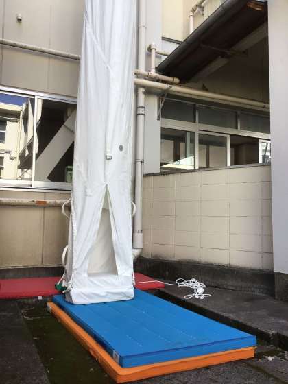 防災訓練で救助袋の体験をしました。怖がりながらも、もしもの時のために果敢にチャレンジしました。