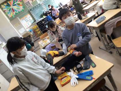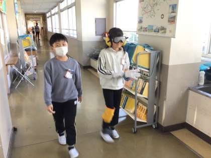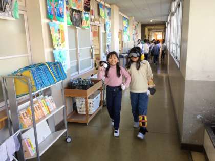 総合の福祉についての学習で、高齢者体験をしました。手足の関節が思うように動かなかったり、目や耳がうまく機能しなかったりする中で、階段を上り下りする苦労を知ることができました。