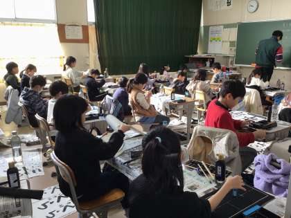 書き初め大会の様子です。一文字一文字心を込めて丁寧に書きました。