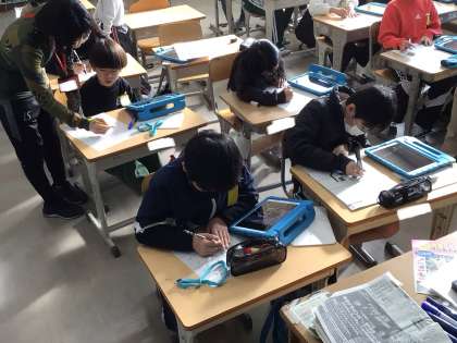 4年 図工 公開日 2025/01/09 更新日 2025/01/09 各学年から 図画工作科「自分をみつめて」では、テーマに沿った自分を彫刻刀で彫って表現できるように、自画像を撮って下書きしています。