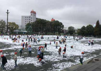休み時間の運動場の様子です。雪がまだ残っていたので、雪遊びを楽しんでいる子がたくさんいました。