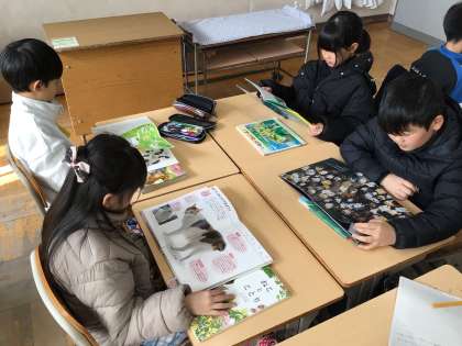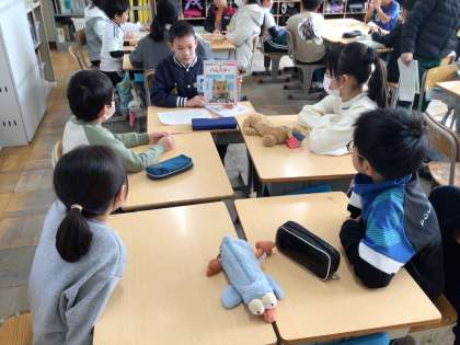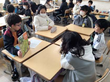 4年 国語 公開日 2025/01/15 更新日 2025/01/15 各学年から 国語の授業で、ブックトークをしました。班ごとに本の魅力を伝え合いました。友達のブックトークを聞いて、普段は手に取らない分類の本に触れて、読書の幅を広げる姿が見られました。