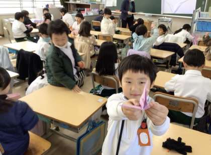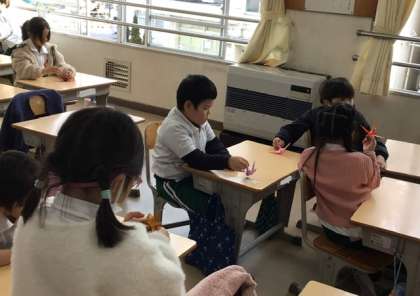 生活科の学習の様子です。昔遊びとして、おり紙で鶴を折っているところでした。自分一人で作ったことがない子がたくさんいましたが、先生や友達のアドバイスで鶴を完成させることができました。明日は、地域のボランティアの皆さんと一緒に、昔遊びを楽しむ予定です。