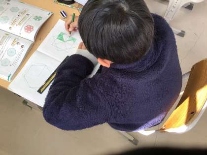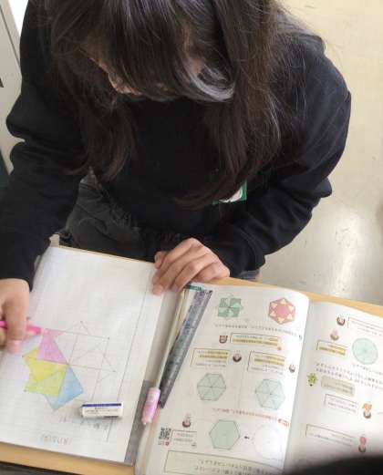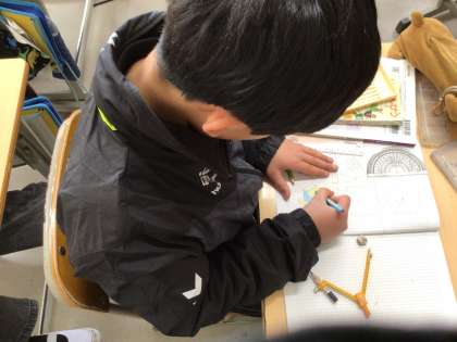 多角形の学習を生かして、模様づくりをしました。正六角形や正八角形の頂点をたよりに、仕上げていきました。