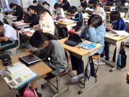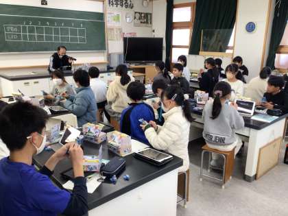 社会科と理科の授業の様子です。社会科では単元のまとめを学習用タブレットで行なっています。理科では手回し発電機を使って豆電球LEDの電気の消費量の違いを調べています。