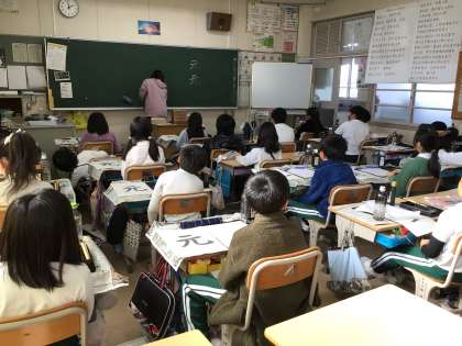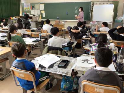書写の授業の様子です。今日は「元」という漢字の書き方を学習しました。曲がりに気をつけて書きました。